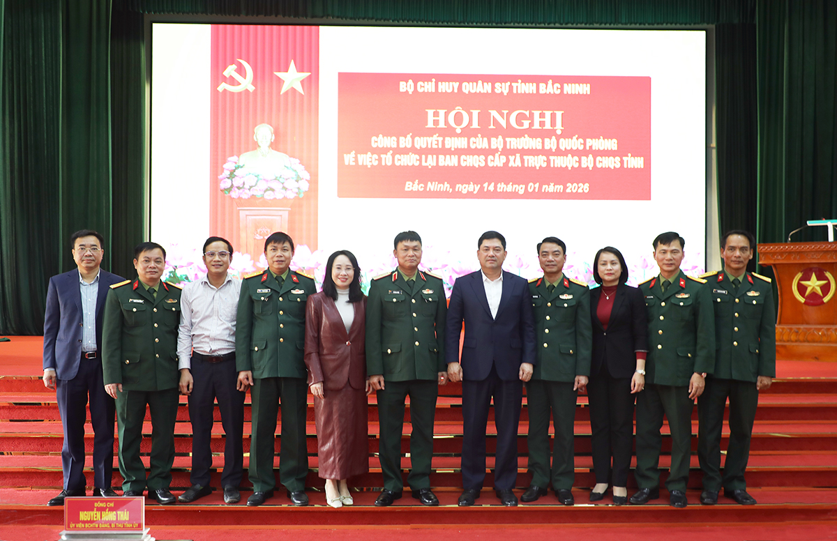 (BNP) - Chiều 14/1, Bộ Chỉ huy Quân sự (CHQS) tỉnh Bắc Ninh tổ chức Hội nghị công bố quyết định của Bộ trưởng Bộ Quốc phòng về việc tổ chức lại Ban Chỉ huy Quân sự cấp xã. Đồng chí Nguyễn Hồng Thái, Ủy viên Trung ương Đảng, Bí thư Tỉnh ủy, Bí thư Đảng ủy Quân sự tỉnh Bắc Ninh dự và chỉ đạo Hội nghị.